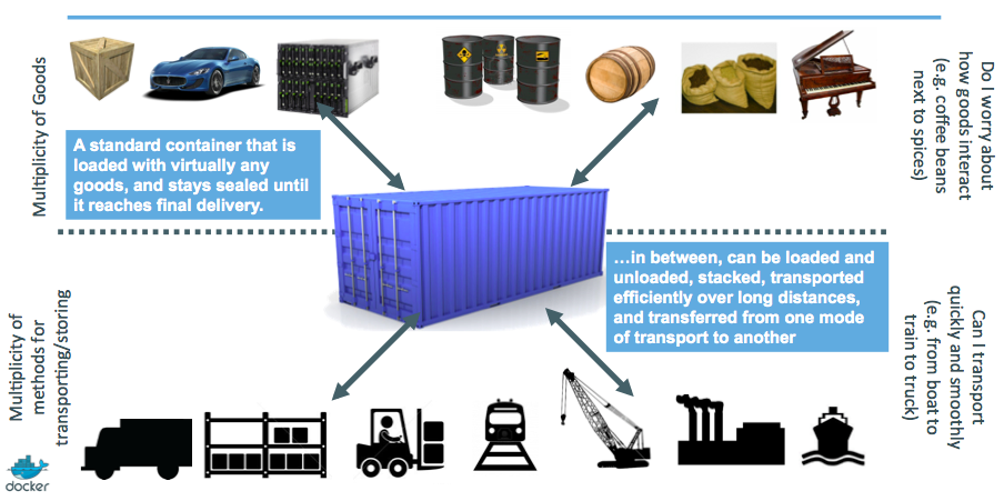Como analogia, podemos pensar no transporte de produtos antes dos anos 60. Nessa época, os itens era carregados e descarregados de forma manual de um meio de transporte para outro, em diferentes pacotes, diferentes tamanhos, ou mesmo de forma solta. E então, contêineres de transporte foram criados, o que fez com que o carregamento de mercadorias e itens entre navios, trens e caminhões se tornasse mais fácil. A ideia do Docker é a mesma (note a logo de Docker, uma baleia com contêineres): simplificar o envio e implantação de códigos, apps e etc, com uso consistente em qualquer plataforma.
