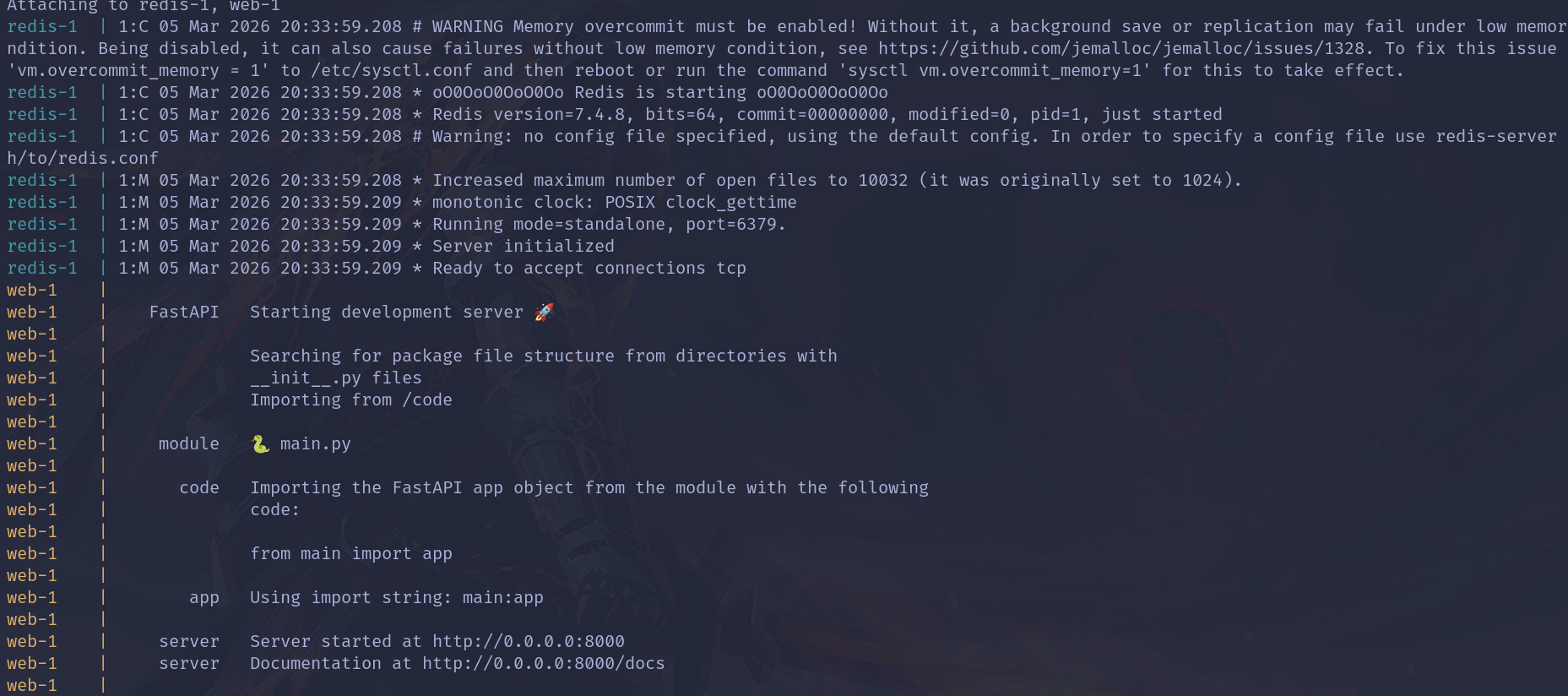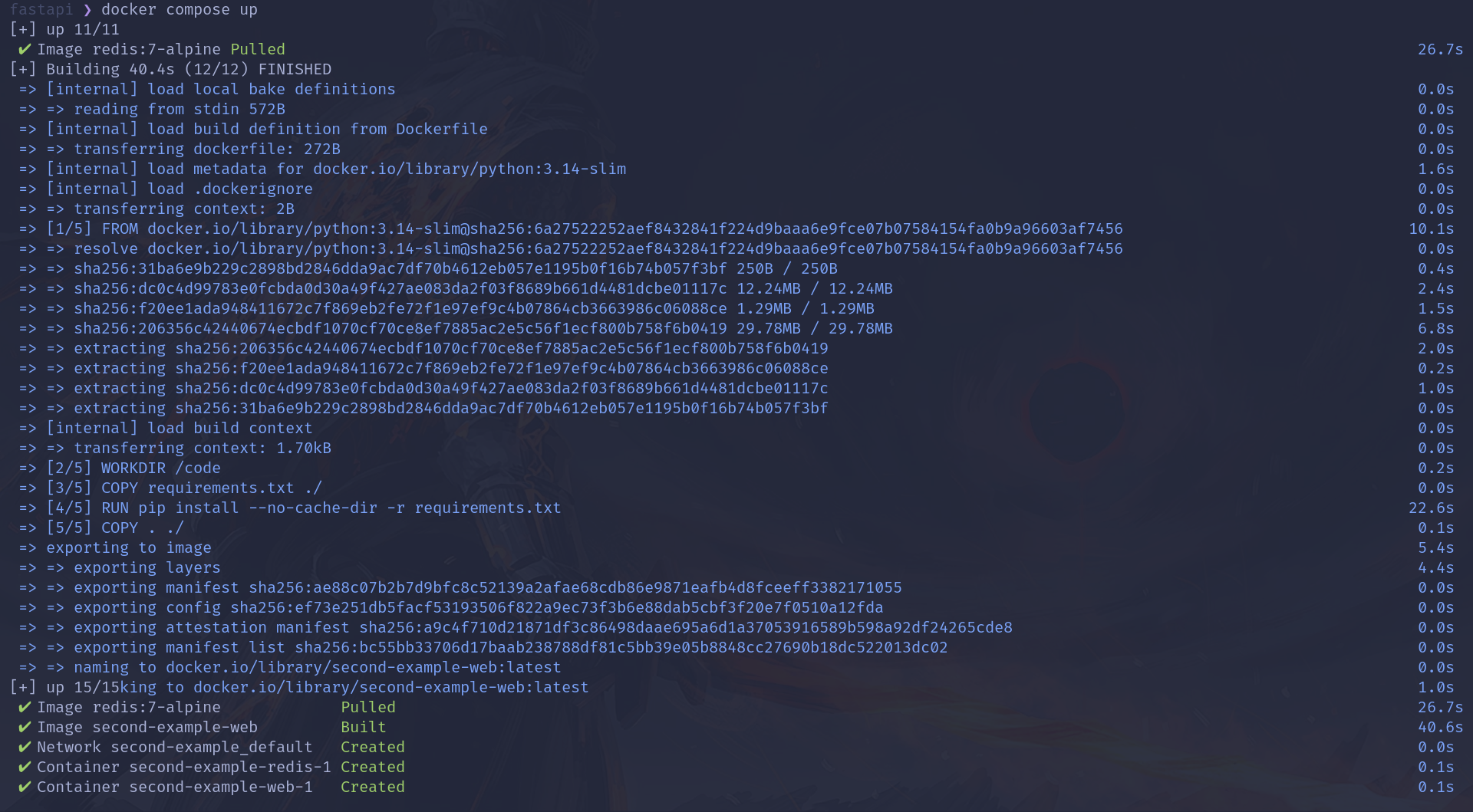 web e redis. O primeiro cuidará do container do nosso servidor FastAPI, enquanto o segundo irá definir um container rodando Redis.build: .), que tenha a porta 8000 exposta para o nosso computador, e definimos uma variável de ambiente REDIS_HOST, usada para o servidor se conectar ao container Redis. Além disso, o serviço web dependerá do serviço redis, com depends_on: ....Por fim, para rodar o sistema por completo, usamos o comando docker compose up. Isso irá fazer a etapa de build da imagem, além de configurar os containers corretamente: