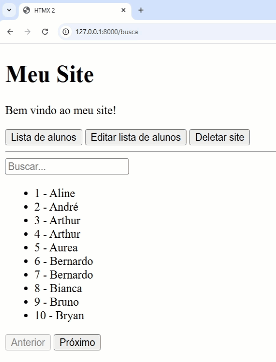 O código acima é uma adaptação do exemplo das páginas da aula passada. Veja abaixo o código utilizando HTMX: